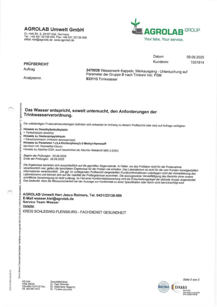 Hier finden Sie einen aktuellen Prüfbericht zur Trinkwasserqualität des Wasserbeschaffungsverbandes Mehlby-Faulück: